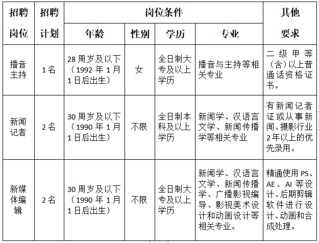 遵守国家宪法和法律,政治素质好,作风正派,有良好的品行和职业道德;热爱媒体宣传事业,有较强的吃苦精神和团队意识、创新意识,身体健康,五官端正,无刑事处罚或吸毒史。